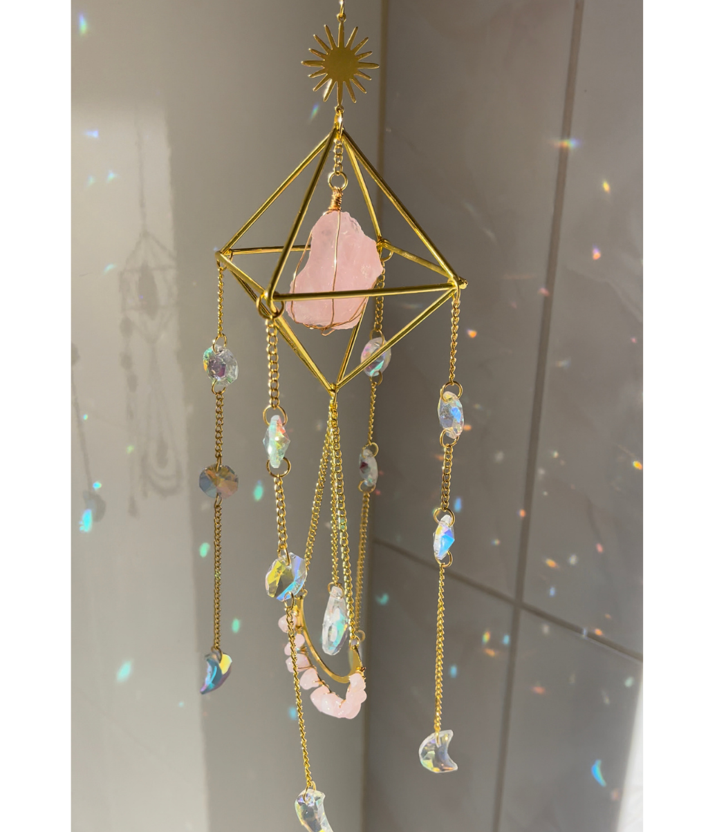 Suncatcher met ruwe rozenkwarts edelsteen in piramide en vele kristallen.
