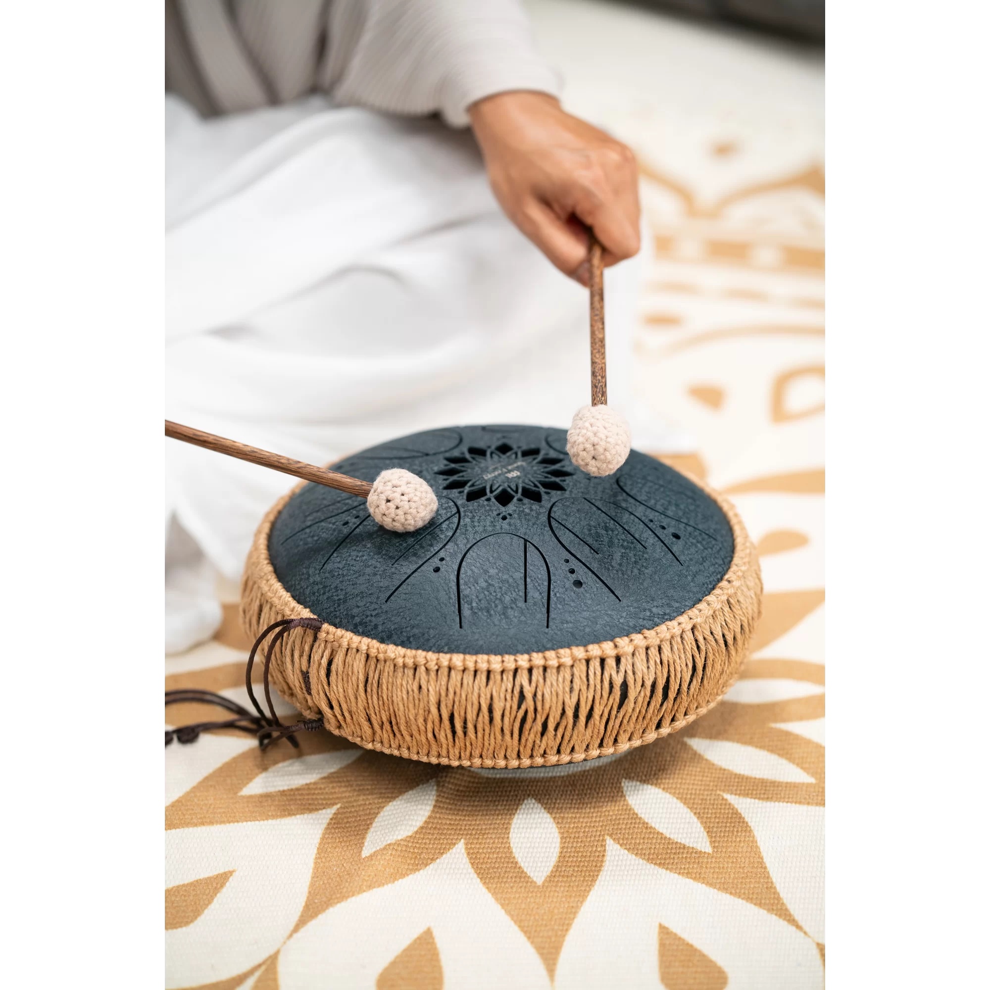 De tongue drum wordt geleverd met twee kloppers; houten steel met rubberen kop die omwikkeld is met gehaakt katoen.
