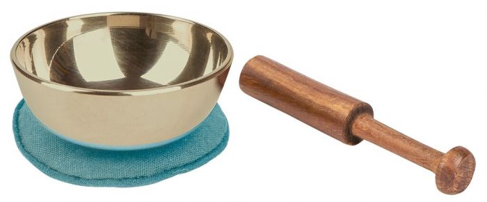 Mini metalen klankschaaltje inclusief houten kloppertje en een zacht kussentje/onderzetter.