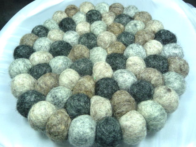 Deze klankschaalonderzetter is gemaakt van vilt en alle bolletjes zijn met de hand aan elkaar genaaid.