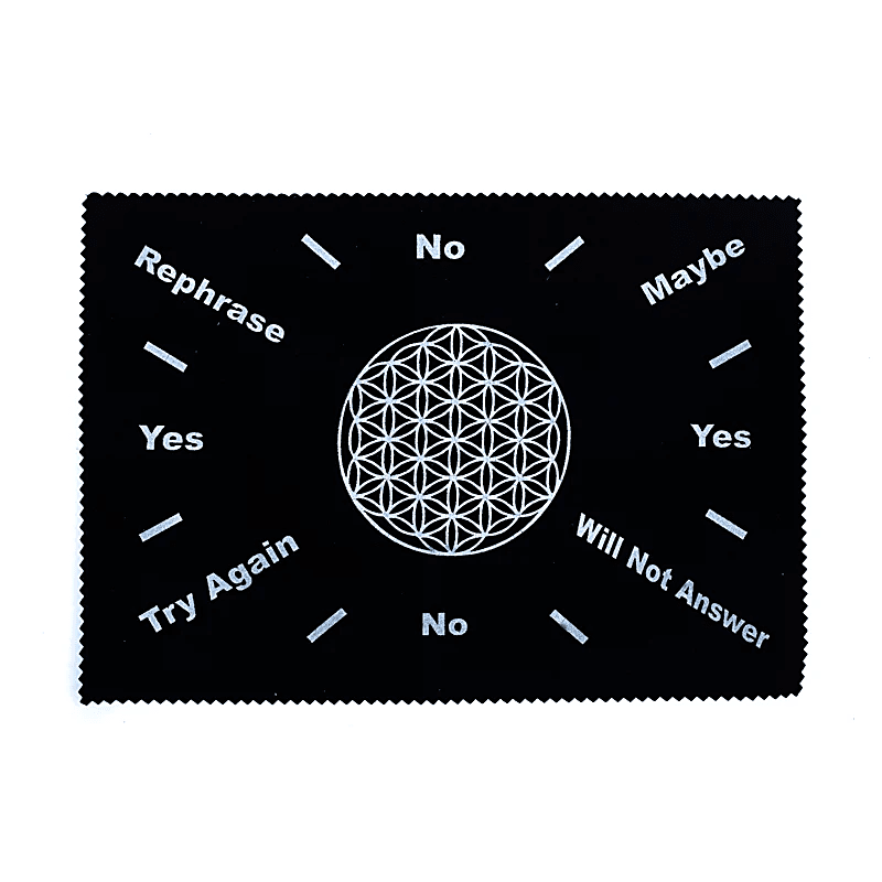 Pendelmat met symbool van de levensbloem in het midden, en antwoord opties rondom in het Engels.