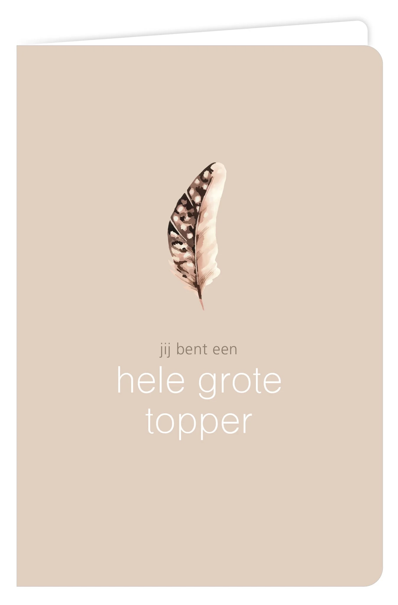 Dubbele wenskaart met de afbeelding van een veer en met de tekst 'Jij bent een hele grote topper'.