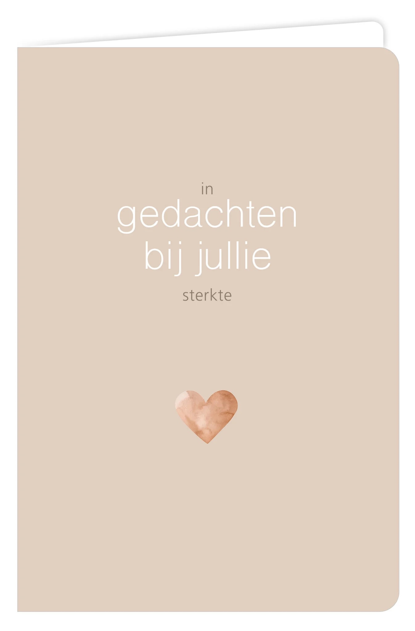 Dubbele wenskaart met de afbeelding van een hartje en met de tekst 'In gedachten bij jullie, sterkte'.