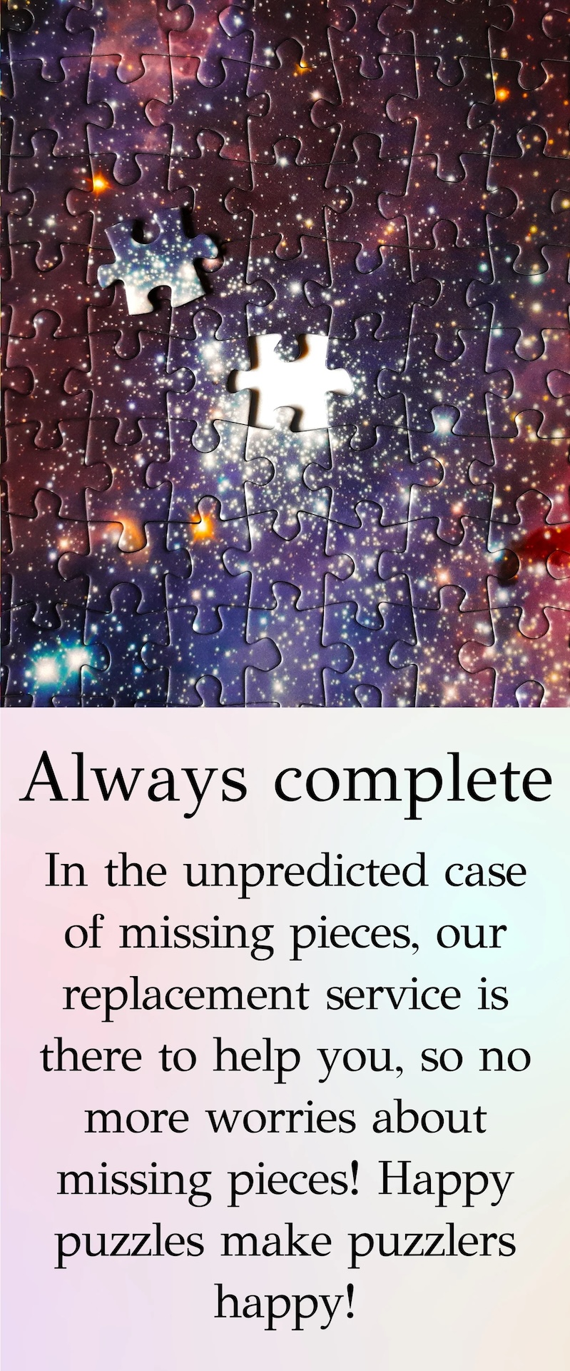 In het onverwachte geval dat er stukjes ontbreken, staat onze vervangingsservice voor u klaar. Geen zorgen meer over ontbrekende stukjes! Puzzelplezier maakt puzzelaars blij!