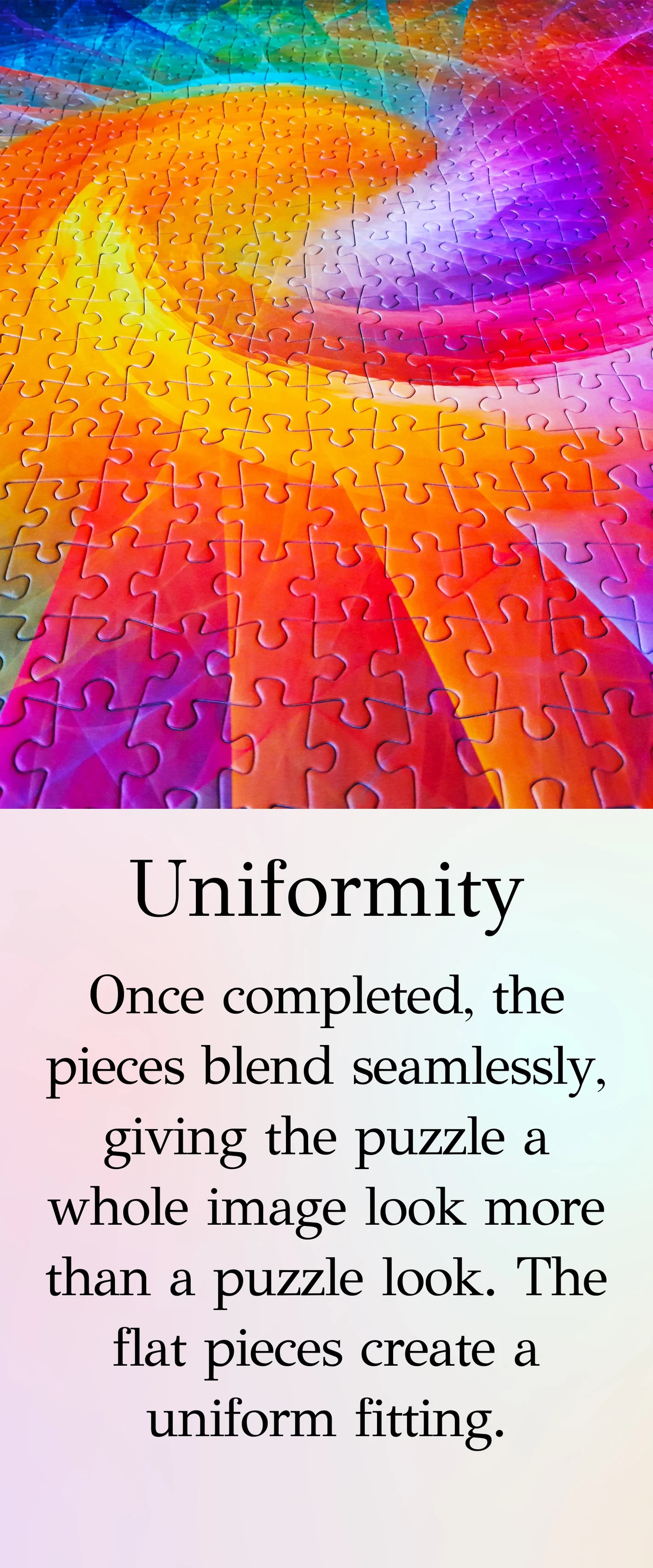Na voltooiing sluiten de stukjes naadloos op elkaar aan, waardoor de puzzel meer op een compleet plaatje lijkt dan op een puzzel. De platte stukjes zorgen voor een uniforme pasvorm.