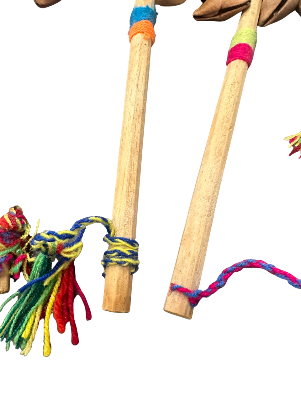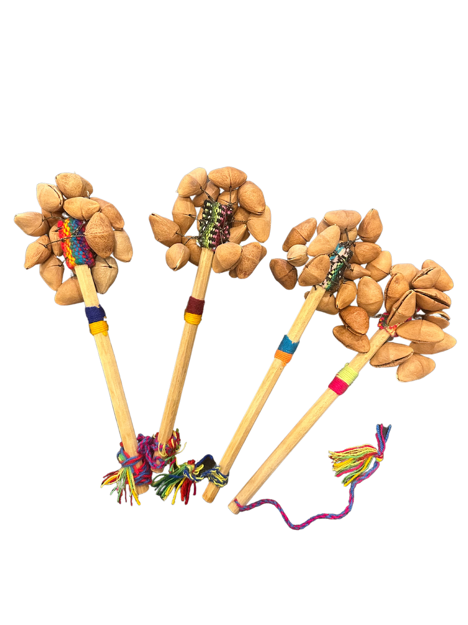 Peru ratel is gemaakt van tobillera nootjes die aan een stokje zijn vastgemaakt d.m.v. touwtjes en afgewerkt met gekleurd band.De afmeting van deze peru ratel is lengte ca. 22 cm en breed ca. 8 cm en heeft ca. 16/17 tobillera nootjes.