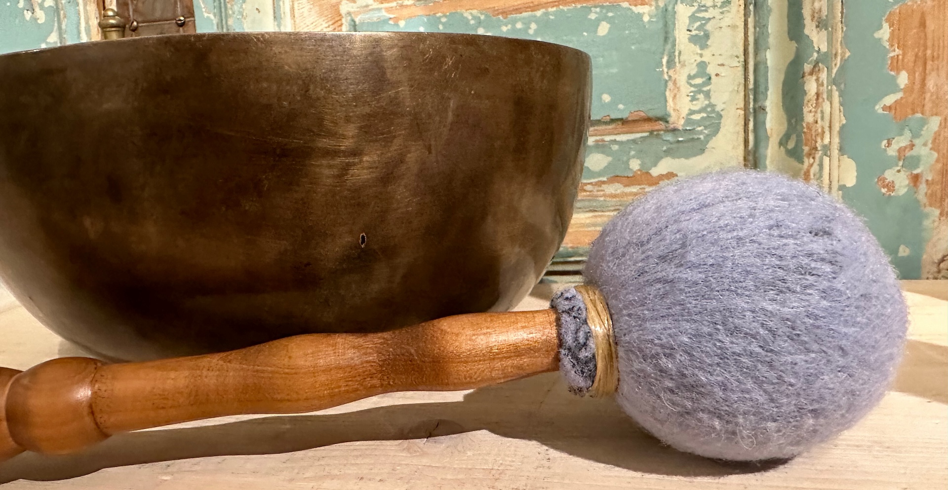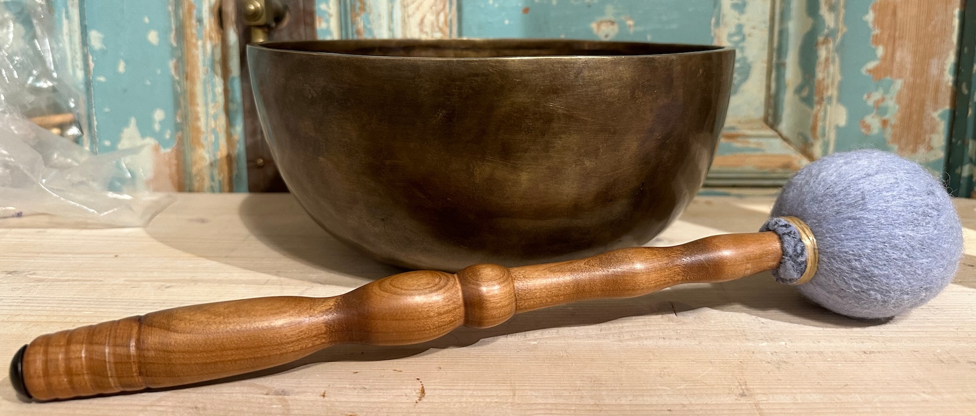 Professionele klankschaal klopper met zachte vilten kop en houten steel. Doordat deze kop iets zachter is, is de aanslag op de klankschaal ook zachter in vergelijking met klankschaal klopper 7.