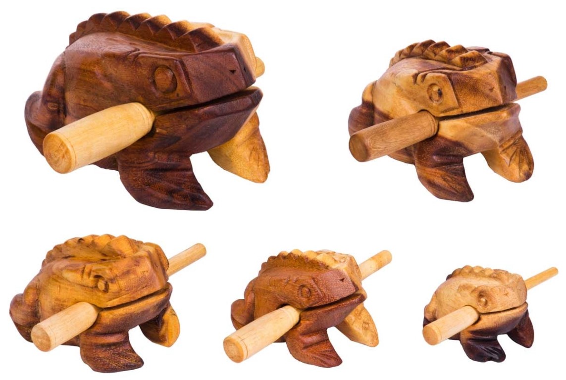 Natuurlijk kan deze houten kikker ook worden gebruikt als guiro en woodblock.