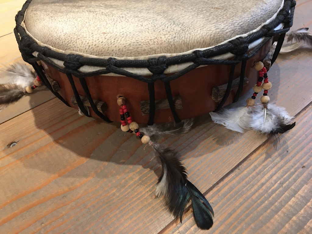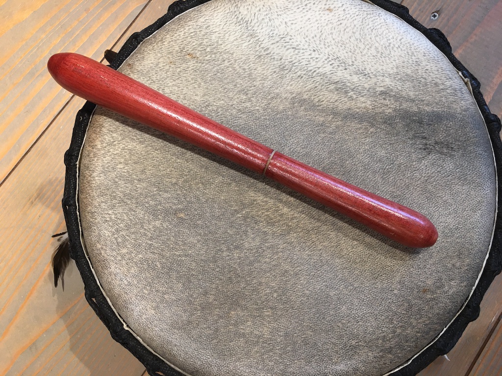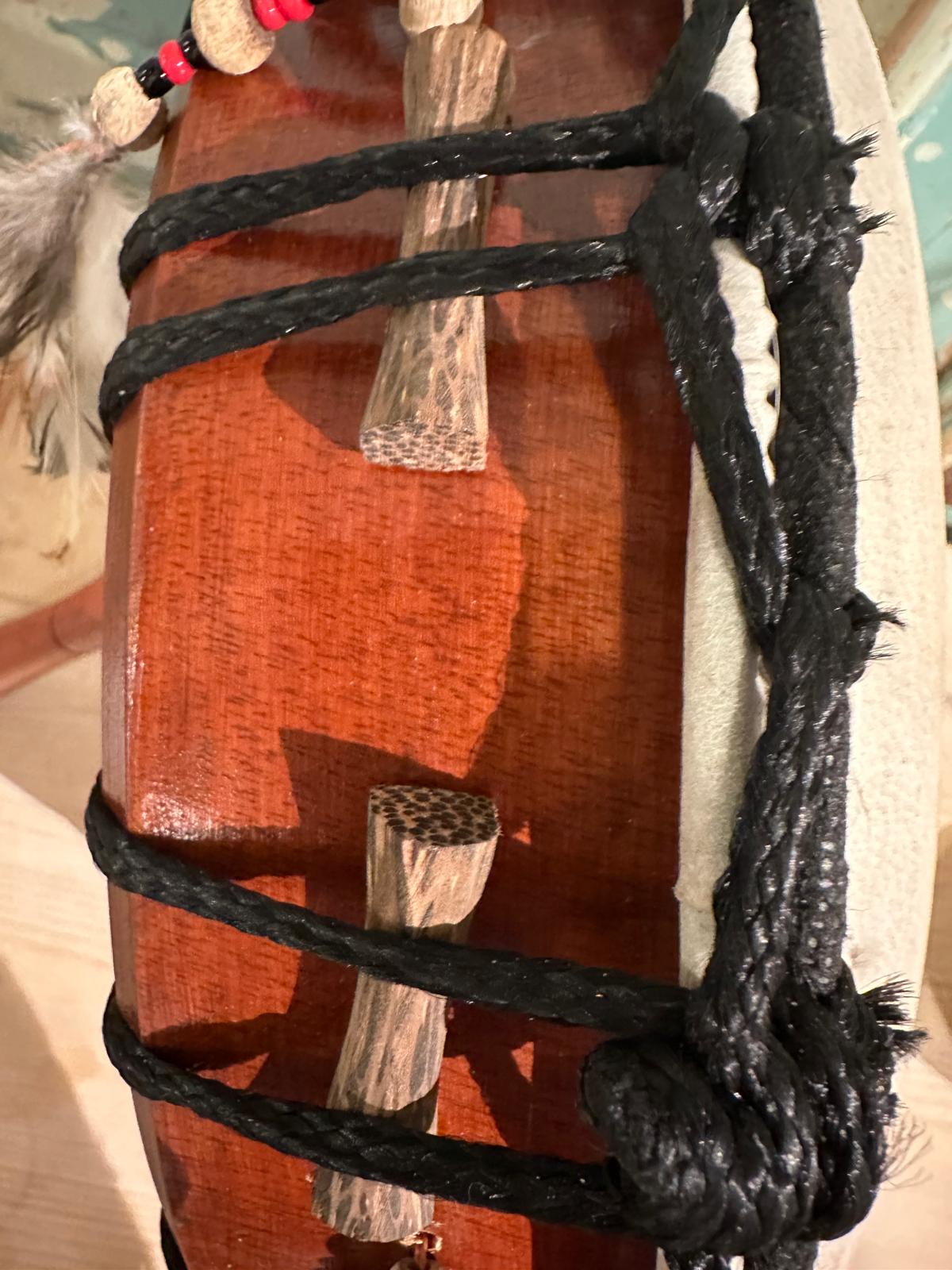 Tegen het frame tussen de touwen in zitten houtjes die je kunt verschuiven zodat je een kleine aanpassing kan maken in de spanning van de huid. Wanneer het vochtig weer is, is de huid wat meer slapper en dan kan het zijn dat de klank vrij dof is en snel weg. Vandaag deze houtjes tussen de touwen.