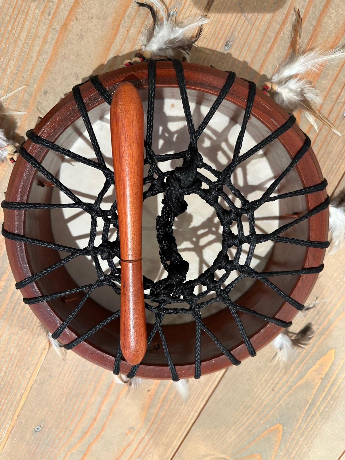 De afmeting van de ritueel drum is hoog ongeveer 9 cm en diameter van de buitenrand is 30 cm.