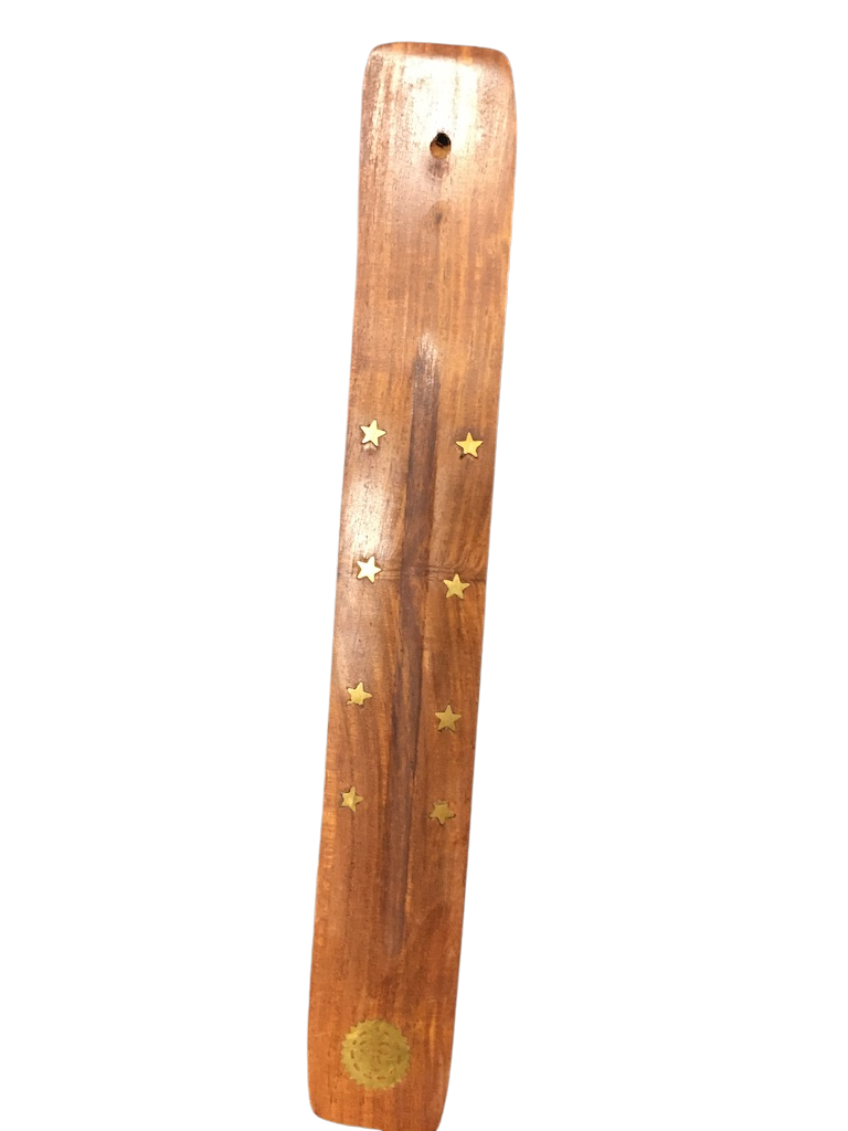 Wierookplankje van acaciahout met een afbeelding van een zonnetje en sterretjes.