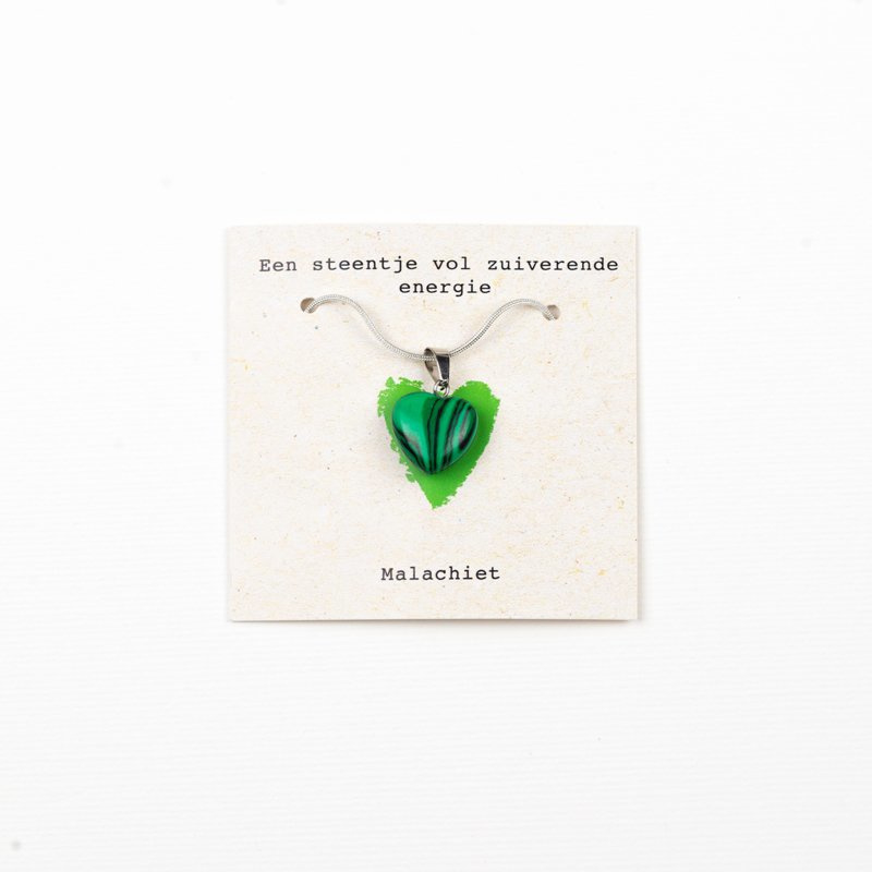 Op de achterzijde van het kaartje staat de werking van de edelsteen Malachiet: