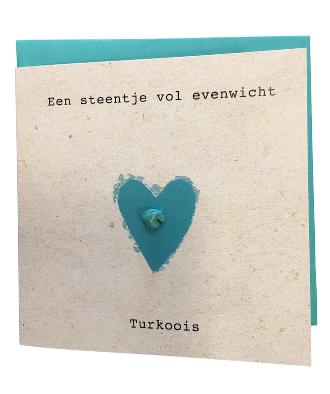 Op de voorzijde van de kaart staat de tekst 'Een steentje vol evenwicht' en er staat een aqua hartje op met een edelsteentje van turkoois in het midden.
