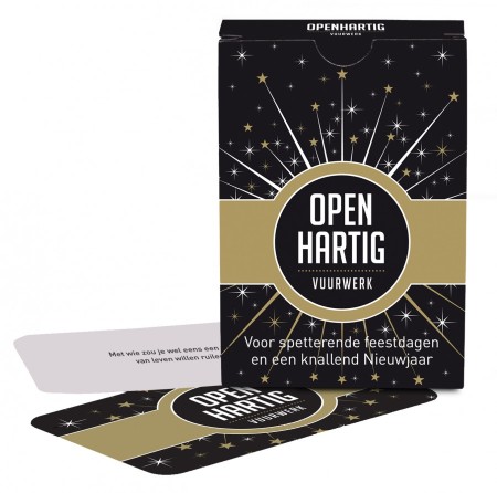 Het spel Openhartig Vuurwerk bestaat uit meer dan 52 vragen en opdrachten en bieden jou, je familieleden en vrienden de gelegenheid om wensen, ideeën en voornemens met elkaar te delen. Ze zorgen voor mooie gesprekken, feestelijke momenten en bovenal voor veel plezier en gezelligheid.
