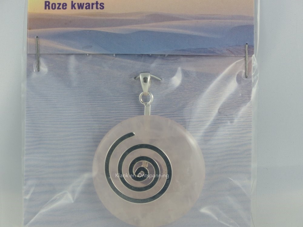 Hanger donut roze kwarts met levensspiraal heeft een diameter van 40 mm. De donut, ook wel Pi-steen genoemd, is met de hand vervaardigd en gepolijst. Pi-steen staat voor de cirkel des levens. De spiraal in het midden is vervaardigd van nikkelvrij, antiallergeen materiaal.