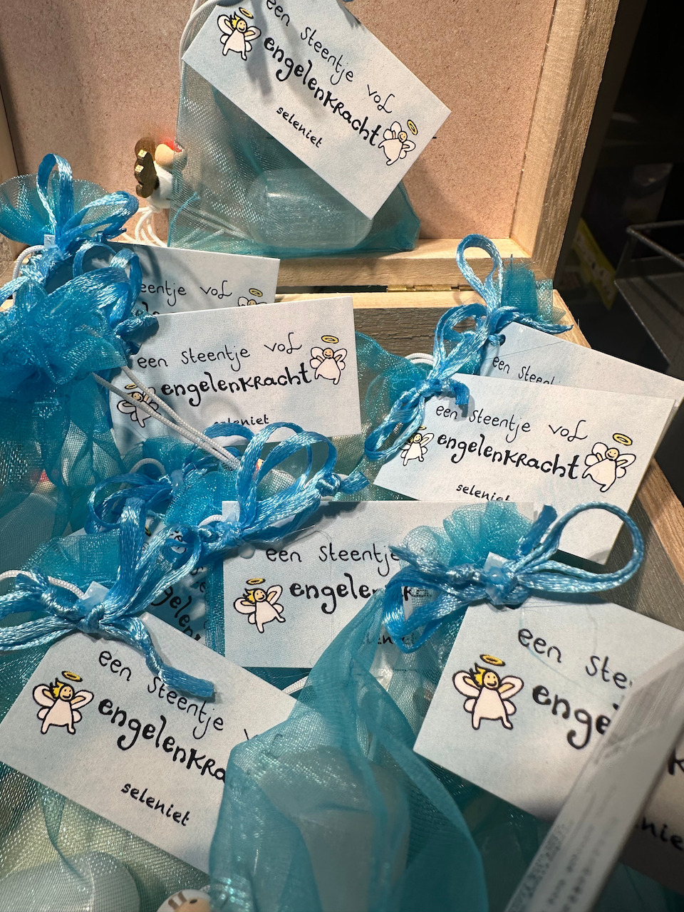 Deze seleniet edelsteen zit verpakt en in organza zakje met een houten engeltje aan een touwtje. Daarnaast zit er een kaartje aan met de tekst 'een steentje vol engelenkracht - seleniet' en aan de andere zijde staat 'Seleniet schenkt rust in het leven'