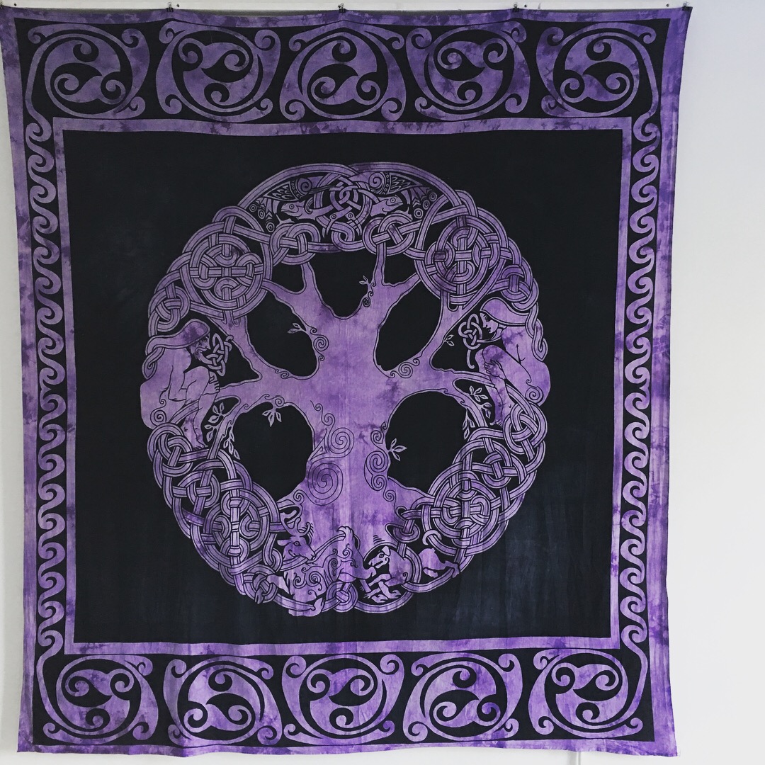 Op een van de foto's staat het kleed uitgehangen in de kleur paars. Dit is om te laten zien hoe de afbeelding van de levensboom, Tree of Life, eruit ziet.
