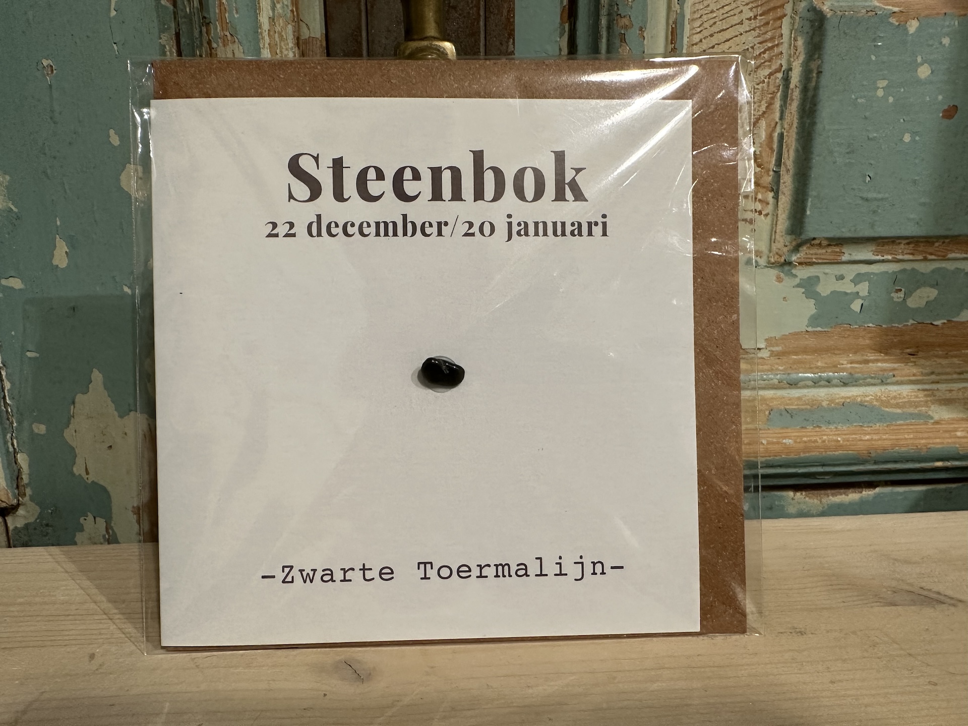 Op de voorzijde van de kaart staat de tekst 'Steenbok 22 december / 21 januari' en er zit een edelsteentje van zwarte toermalijn in het midden.