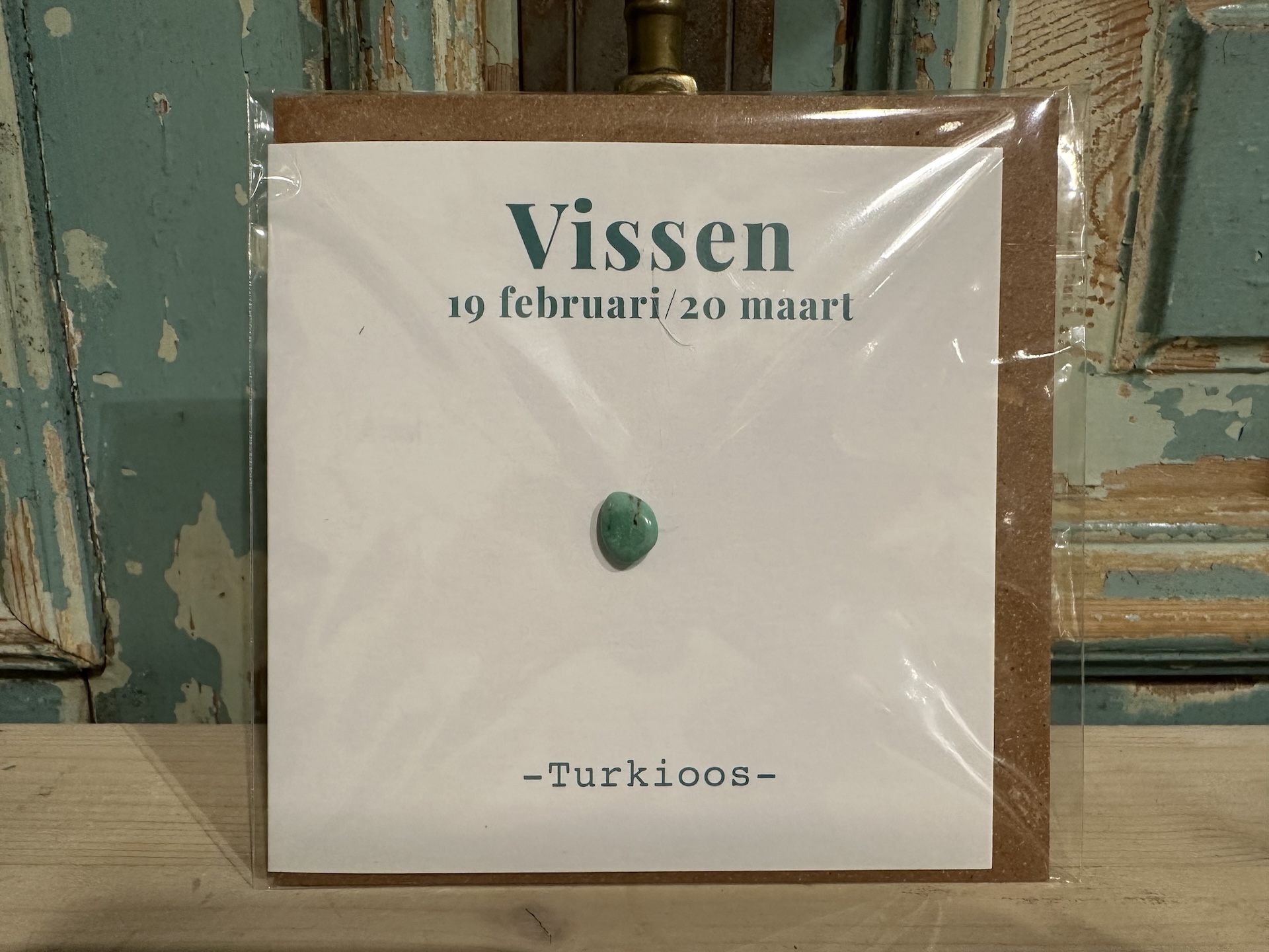 Op de voorzijde van de kaart staat de tekst 'Vissen 19 februari / 20 maart' en er zit een edelsteentje van turkoois in het midden.