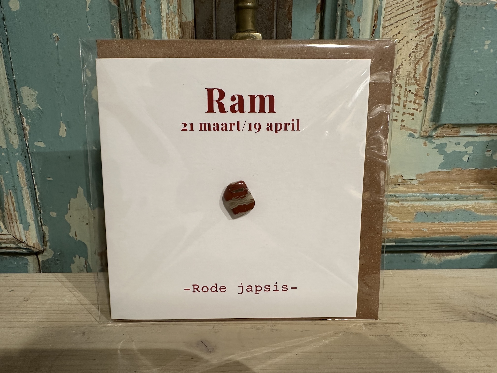 Op de voorzijde van de kaart staat de tekst 'Ram 21 maart / 19 april' en er zit een edelsteentje van rode jaspis in het midden.
