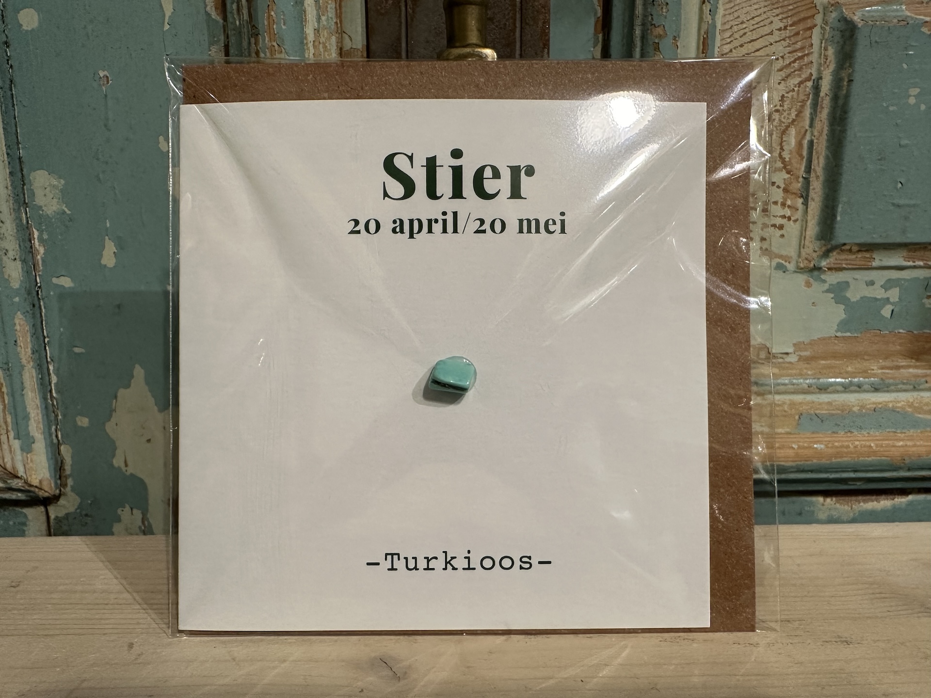Op de voorzijde van de kaart staat de tekst 'Stier 20 april / 20 mei' en er zit een edelsteentje van turkoois in het midden.