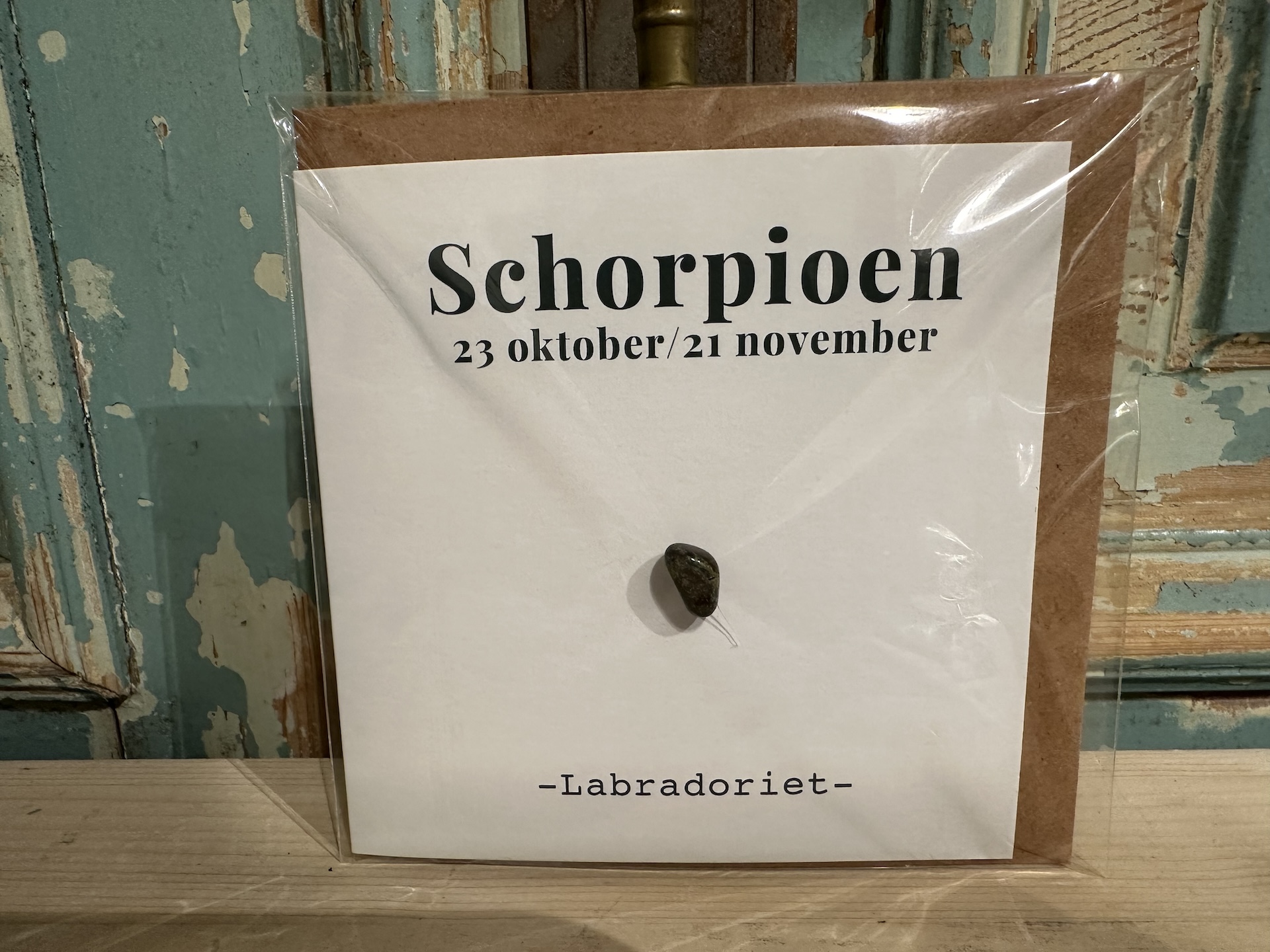Op de voorzijde van de kaart staat de tekst 'Schorpioen 23 oktober / 21 november' en er zit een edelsteentje van labradoriet in het midden.