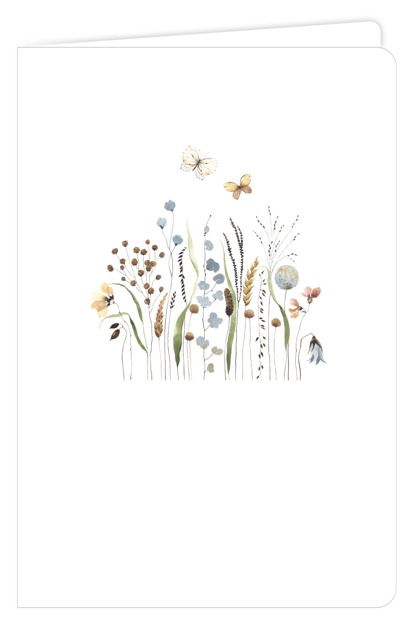Dubbele wenskaart met de afbeelding van wilde bloemen en vlinders maar zonder tekst. Bij deze dubbele wenskaart zit een enveloppe.