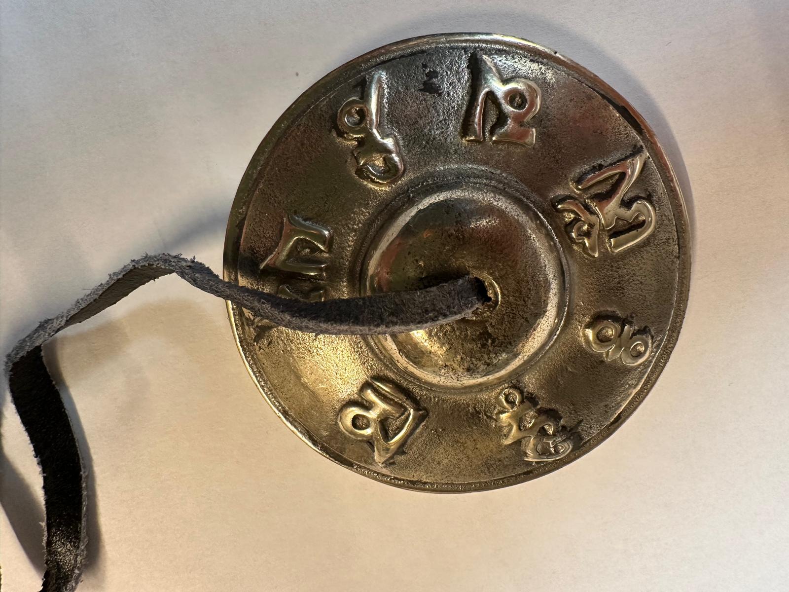 Tingsha's versierd met de Om mani padme hum mantra. Dit is de mantra van mededogen en tevens van het zuiveren en balanceren van de mannelijke energie van methode en de vrouwelijke energie van wijsheid.