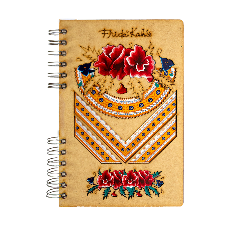 Deze notitieboekjes hebben een houten kaft waar diverse figuren, afbeeldingen en teksten in zijn uitgesneden door een laser.