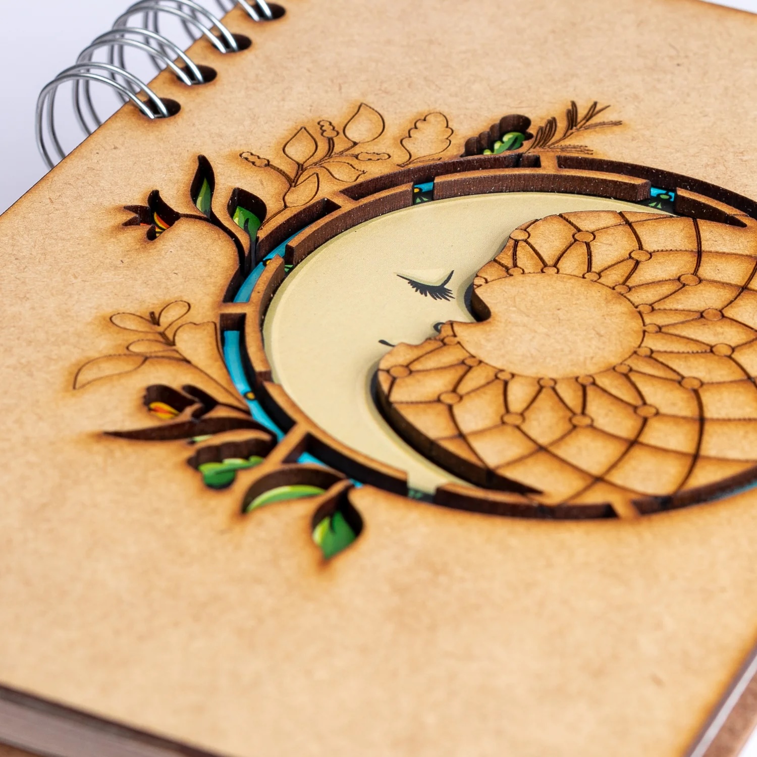 Deze notitieboekjes hebben een houten kaft waar diverse figuren, afbeeldingen en teksten in zijn uitgesneden door een laser.
