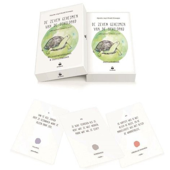 De zeven geheimen van de schildpad bestaat uit 49 inspiratiekaarten en een instructieboek.