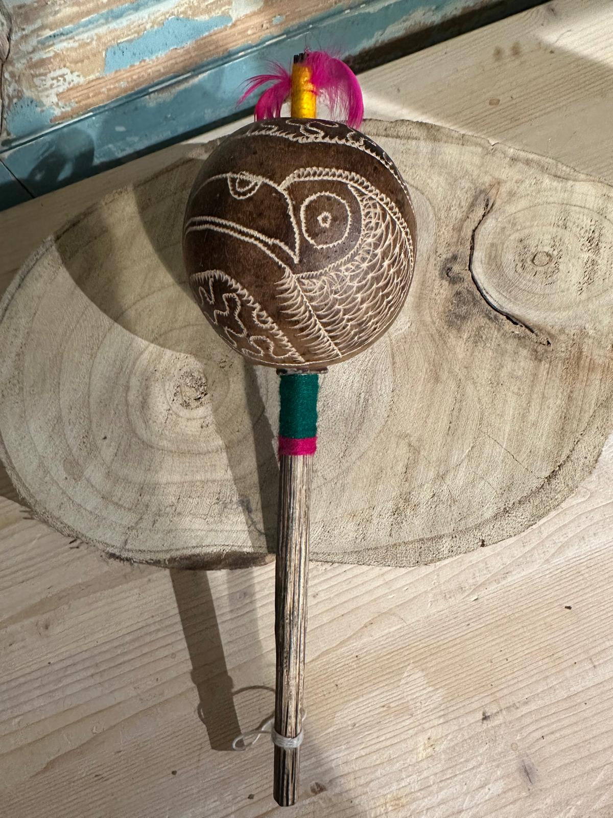 Deze uit Zuid Amerika afkomstige sjamanenratel heeft heel veel verschillende benamingen zoals; peruaanse ratel, maraca of maracca, wingo en shipibo.