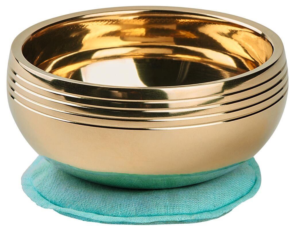 Metalen klankschaal met houten klopper op een zacht kussentje, in een mooie geschenkbox.