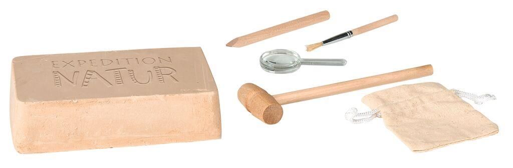 De set bevat 5 echte mineralen, gereedschappen van berkenhout (loep, penseel, beitel en hamer), een tasje om ze in op te bergen en een informatief boekje (ook Nederlandstalig) waarin meer uitleg staat over de spannende wereld van de paleontologie en meer informatie over 15 soorten mineralen.