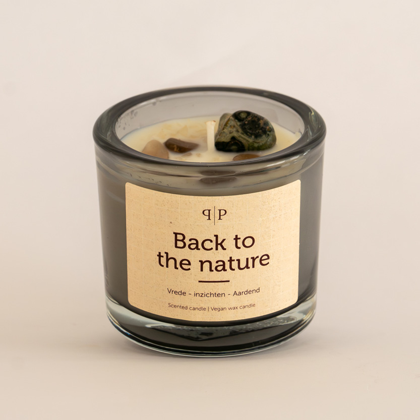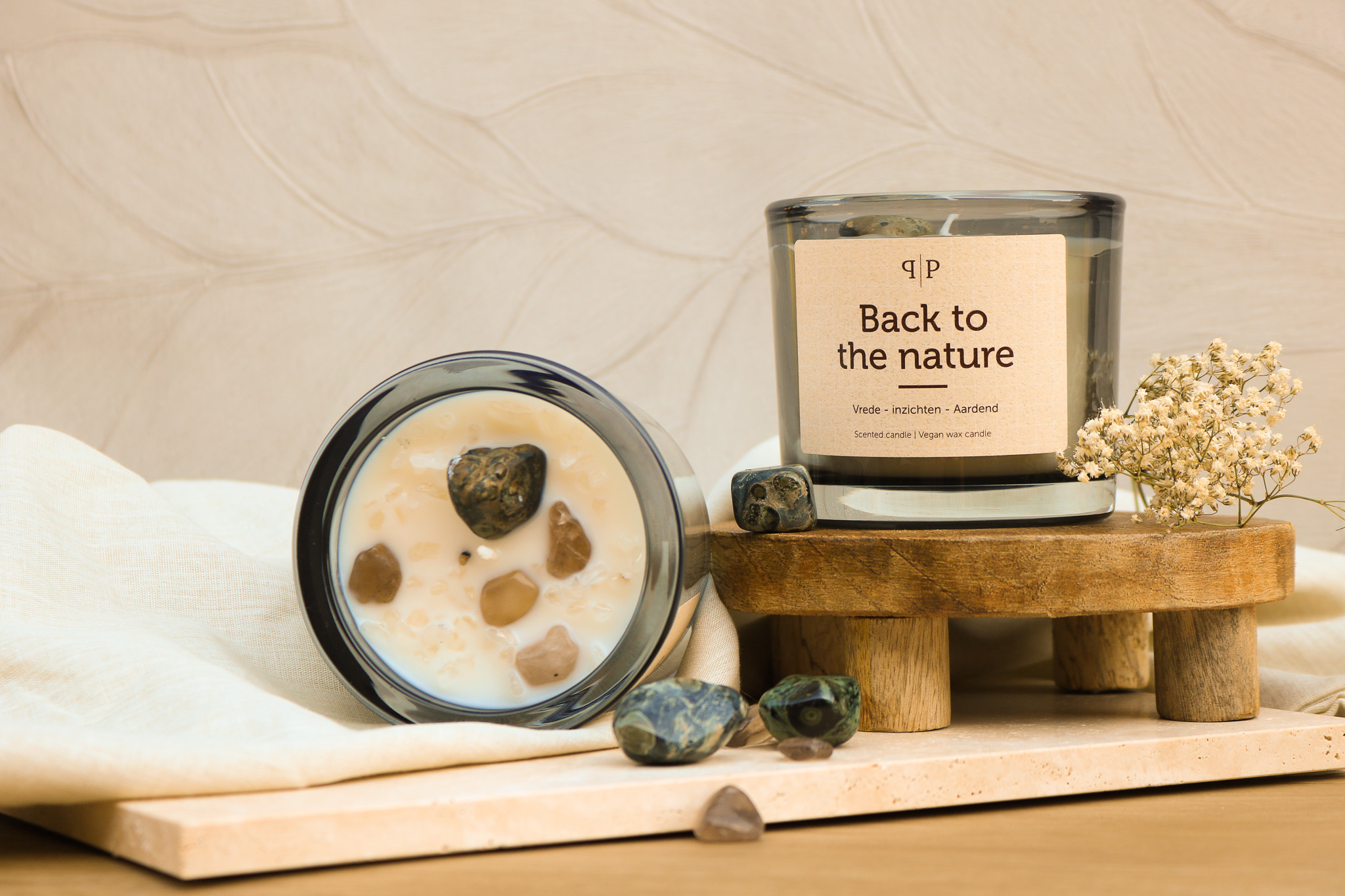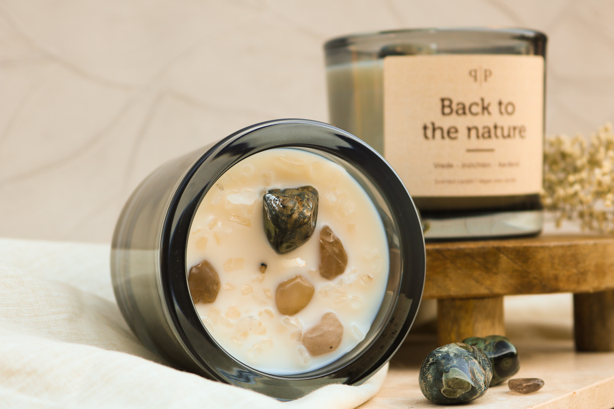 Deze edelstenen staan voor; een liefdevolle groet in een kaars. De Back to the nature geurkaars is gevuld met kambaba en rookkwarts.