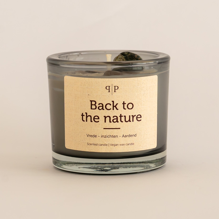 De geur van de ‘Back to the nature kaars is Flowers from grasse. Top: groen & kruidnagel - Hart: roos & Lelietje-van-dalen - Basis: labdanum, benzoin & saffraan