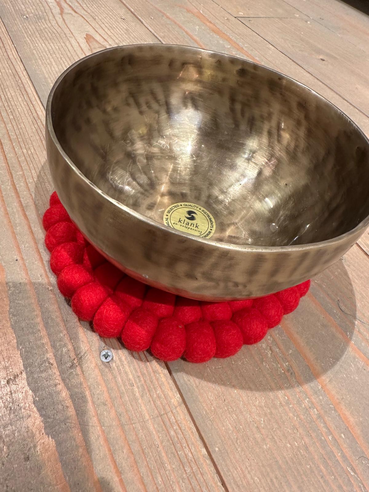 Deze klankschaalonderzetter vilt heeft de kleur rood. De kleur rood staat voor het 1ste chakra.