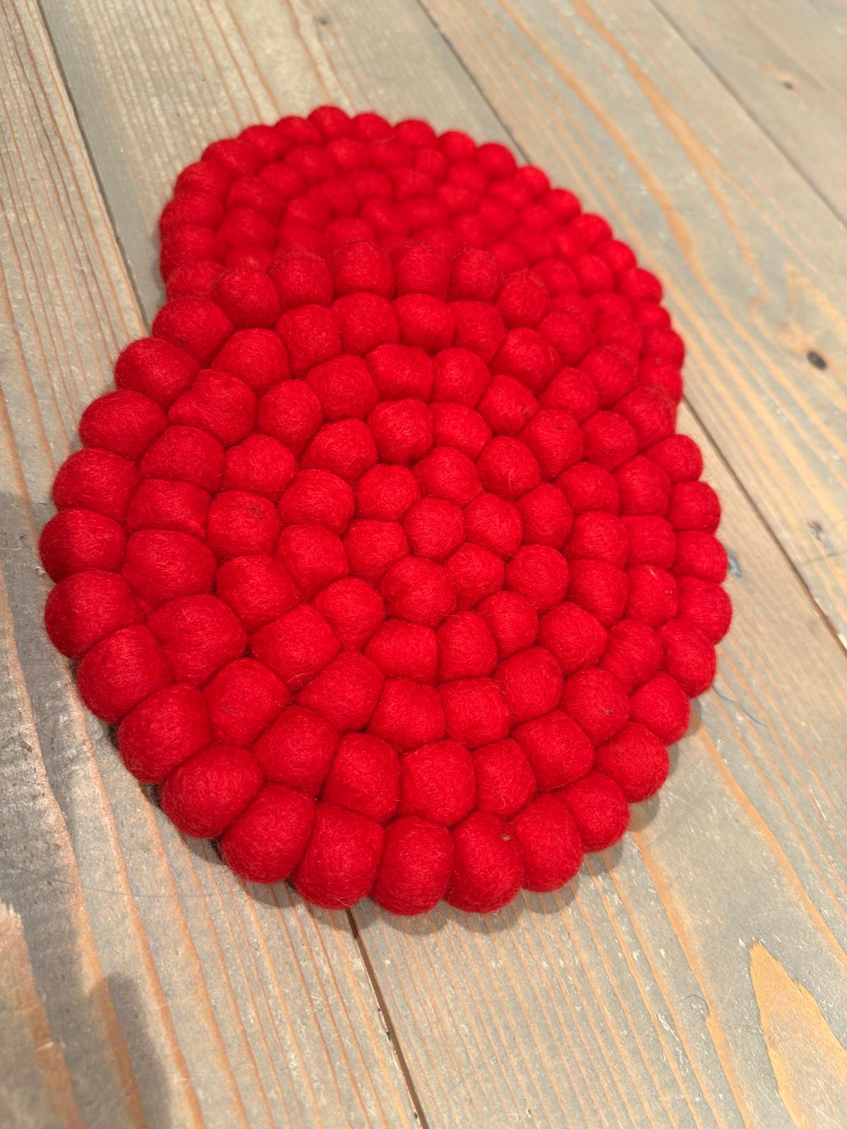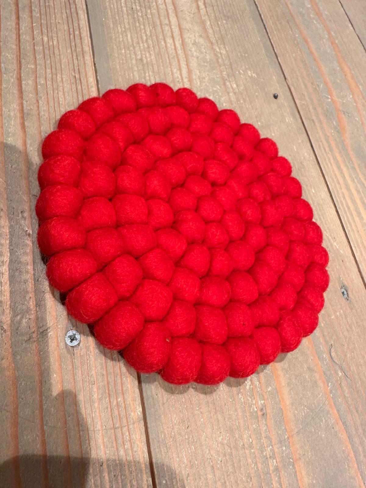 Deze klankschaalonderzetter is gemaakt van vilt en alle bolletjes zijn met de hand aan elkaar genaaid.