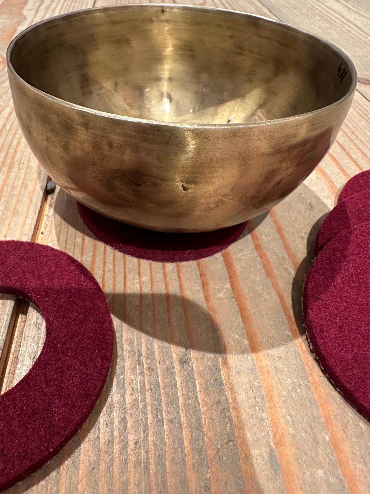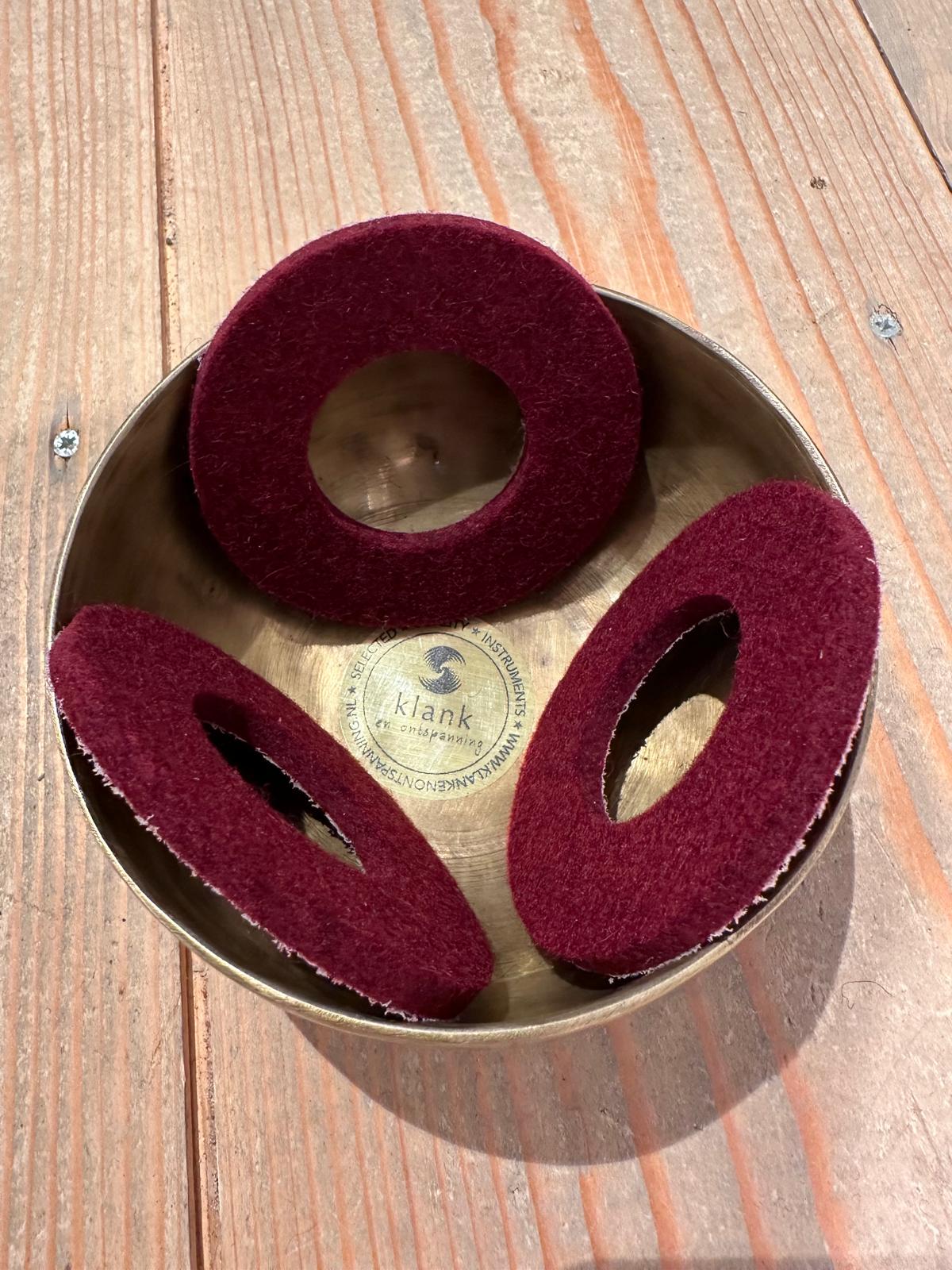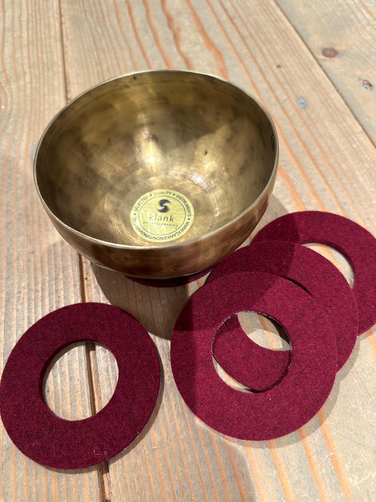 Een klankschaal moet je niet op een harde ondergrond zetten en dan gebruik je een onderzetter zoals deze dunne ringen van donkerrood, stevig vilt.