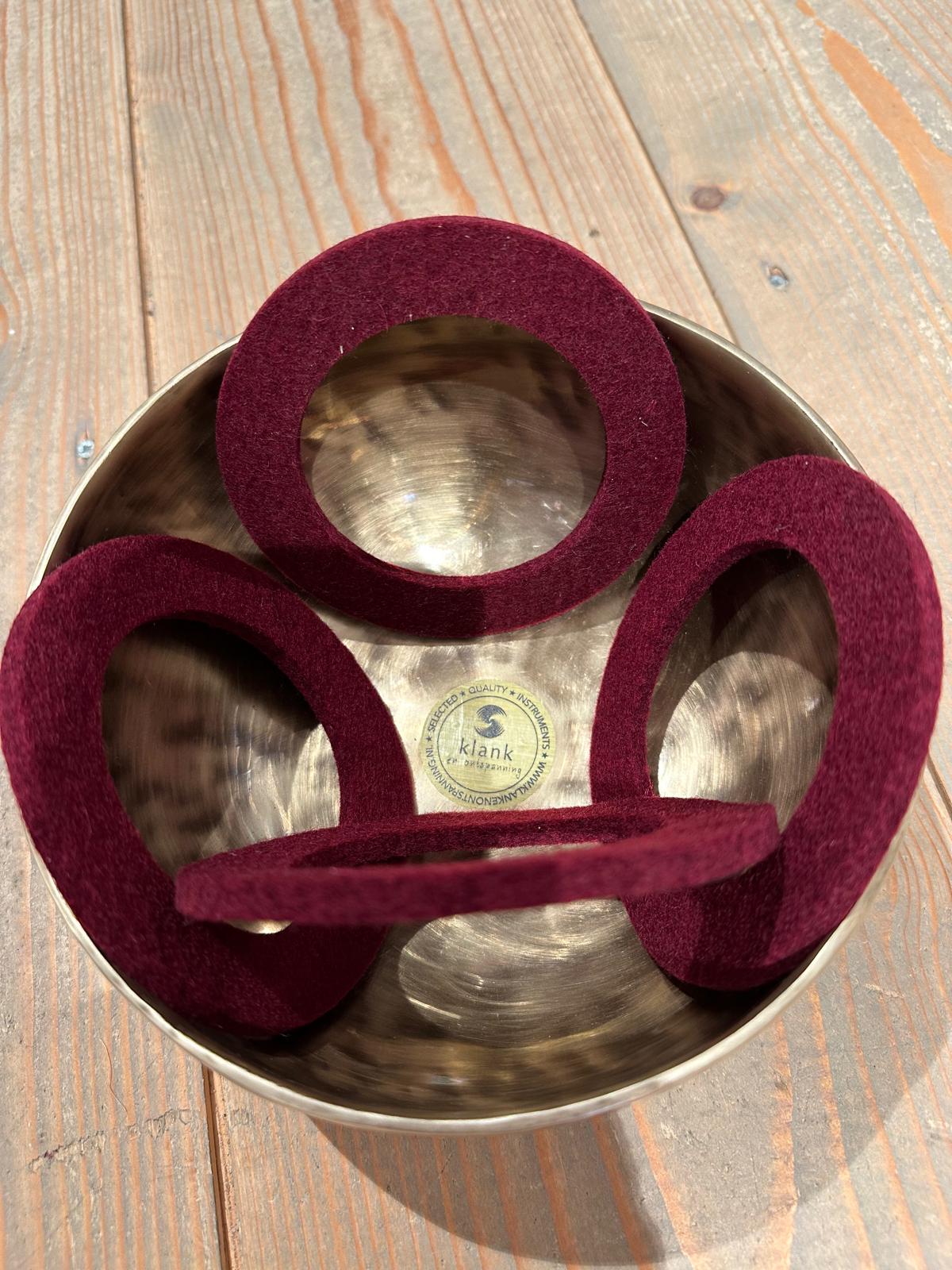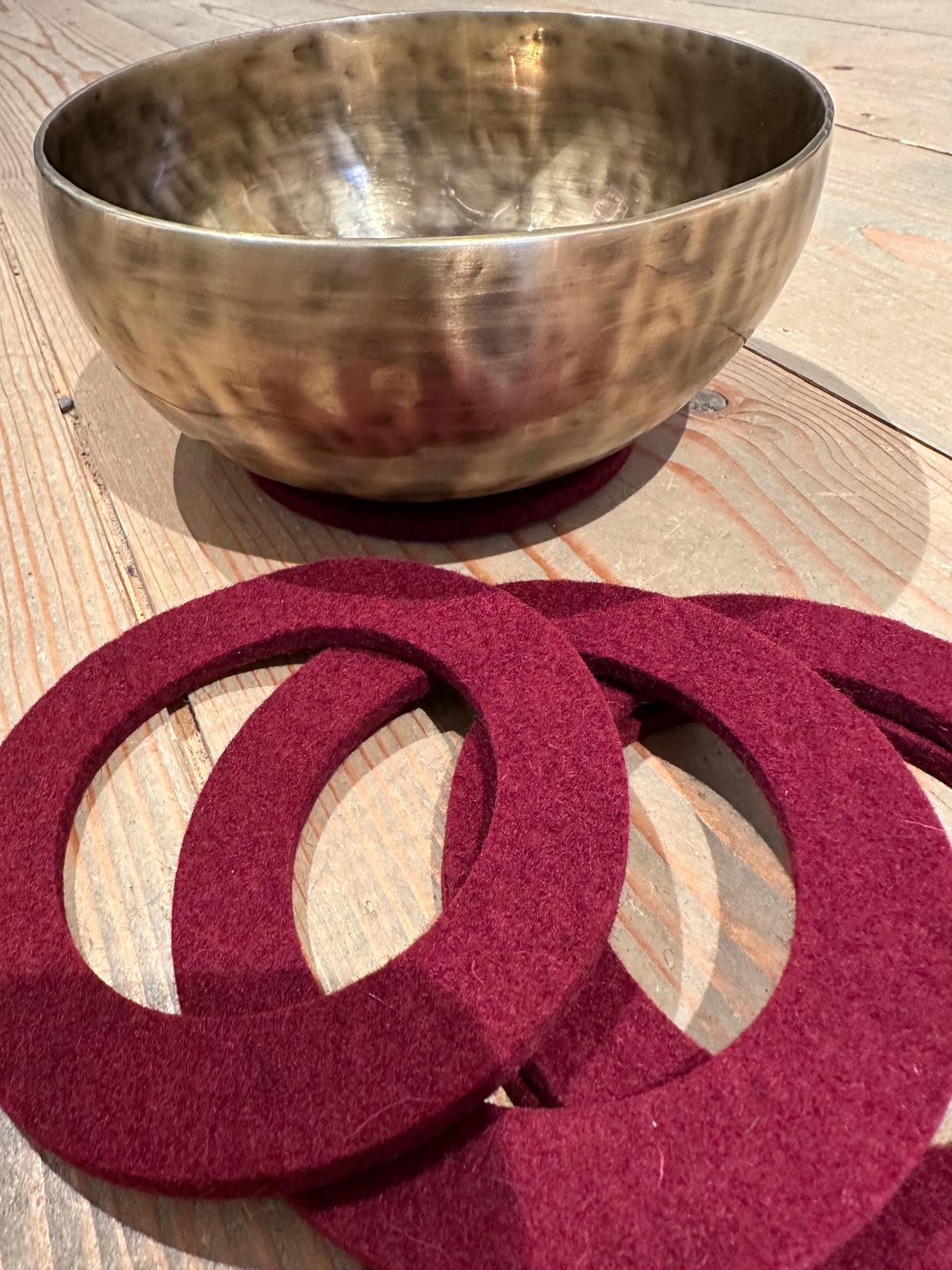 Een klankschaal moet je niet op een harde ondergrond zetten en dan gebruik je een onderzetter zoals deze dunne ringen van donkerrood, stevig vilt.