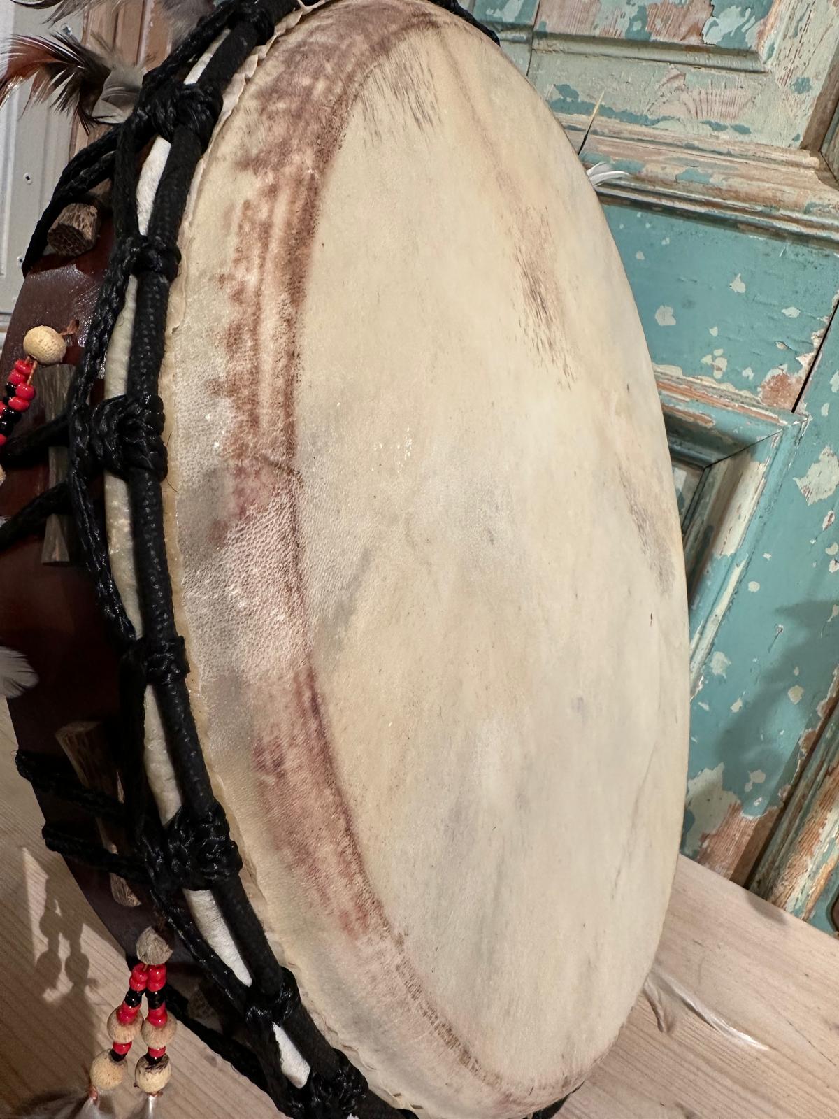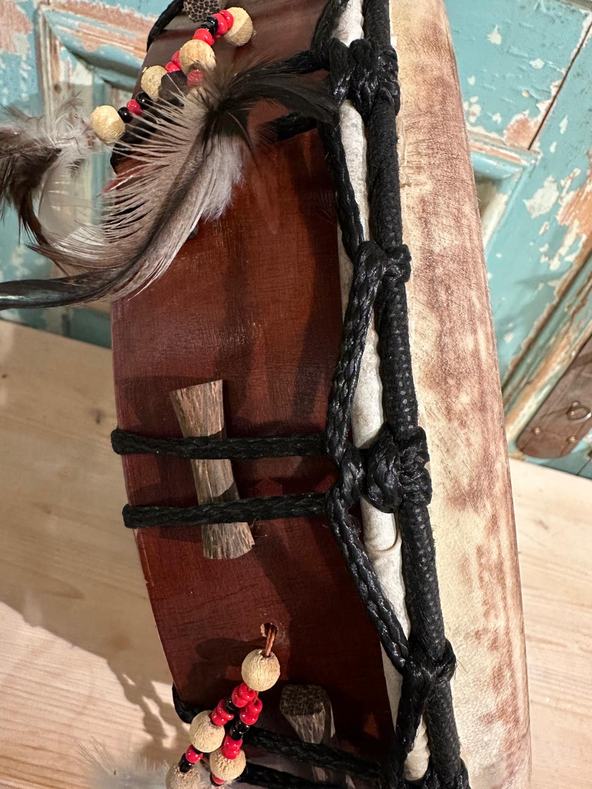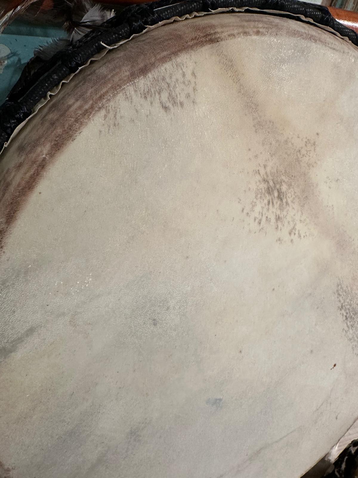 De afmeting van de ritueel drum is hoog ongeveer 9 cm en diameter van de buitenrand is 38 cm.