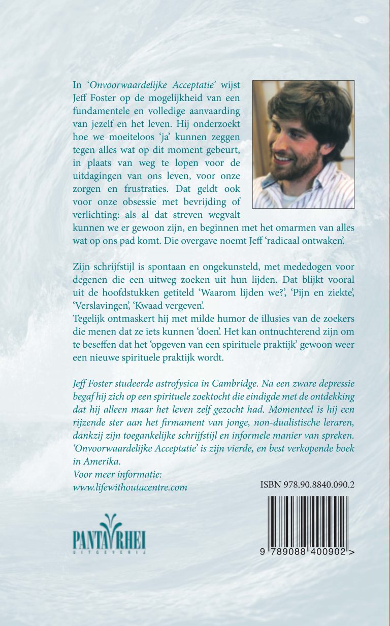 In Onvoorwaardelijke Acceptatie wijst Jeff Foster op de mogelijkheid van een fundamentele en volledige aanvaarding van jezelf en het leven. Hij onderzoekt hoe we moeiteloos ‘ja’ kunnen zeggen tegen alles wat op dit moment gebeurt, in plaats van weg te lopen voor de uitdagingen van ons leven, voor onze zorgen en frustraties. Dat geldt ook voor onze obsessie met bevrijding of verlichting: als al dat streven wegvalt kunnen we er gewoon zijn, en beginnen met het omarmen van alles wat op ons pad komt. Die overgave noemt Jeff ‘radicaal ontwaken’.