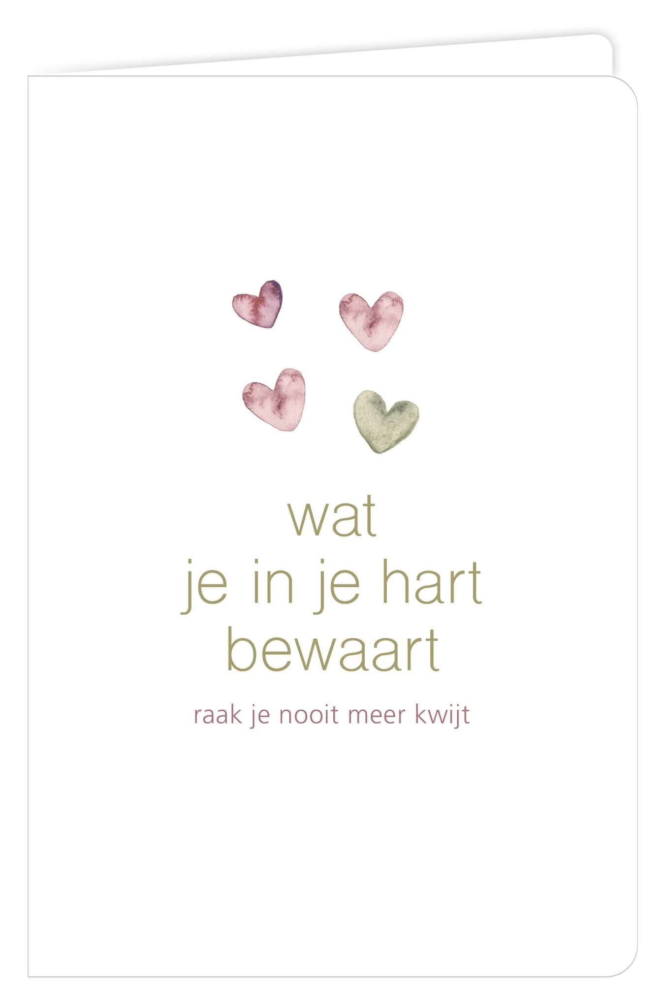 Dubbele wenskaart met de afbeelding van meerdere hartjes en met de tekst 'wat je in je hart bewaart raak je nooit meer kwijt'.