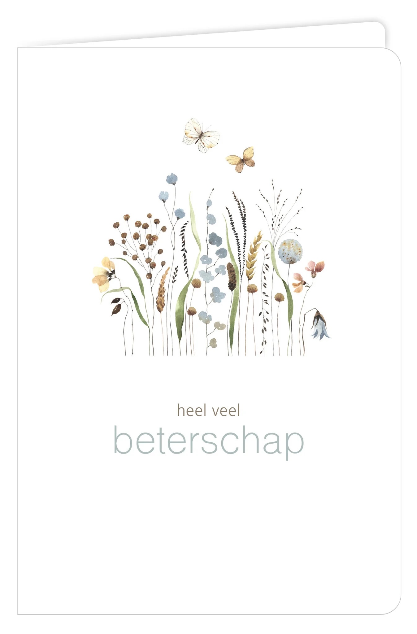 Dubbele wenskaart met de afbeelding van veldbloemen met vlinders en met de tekst 'heel veel beterschap'.