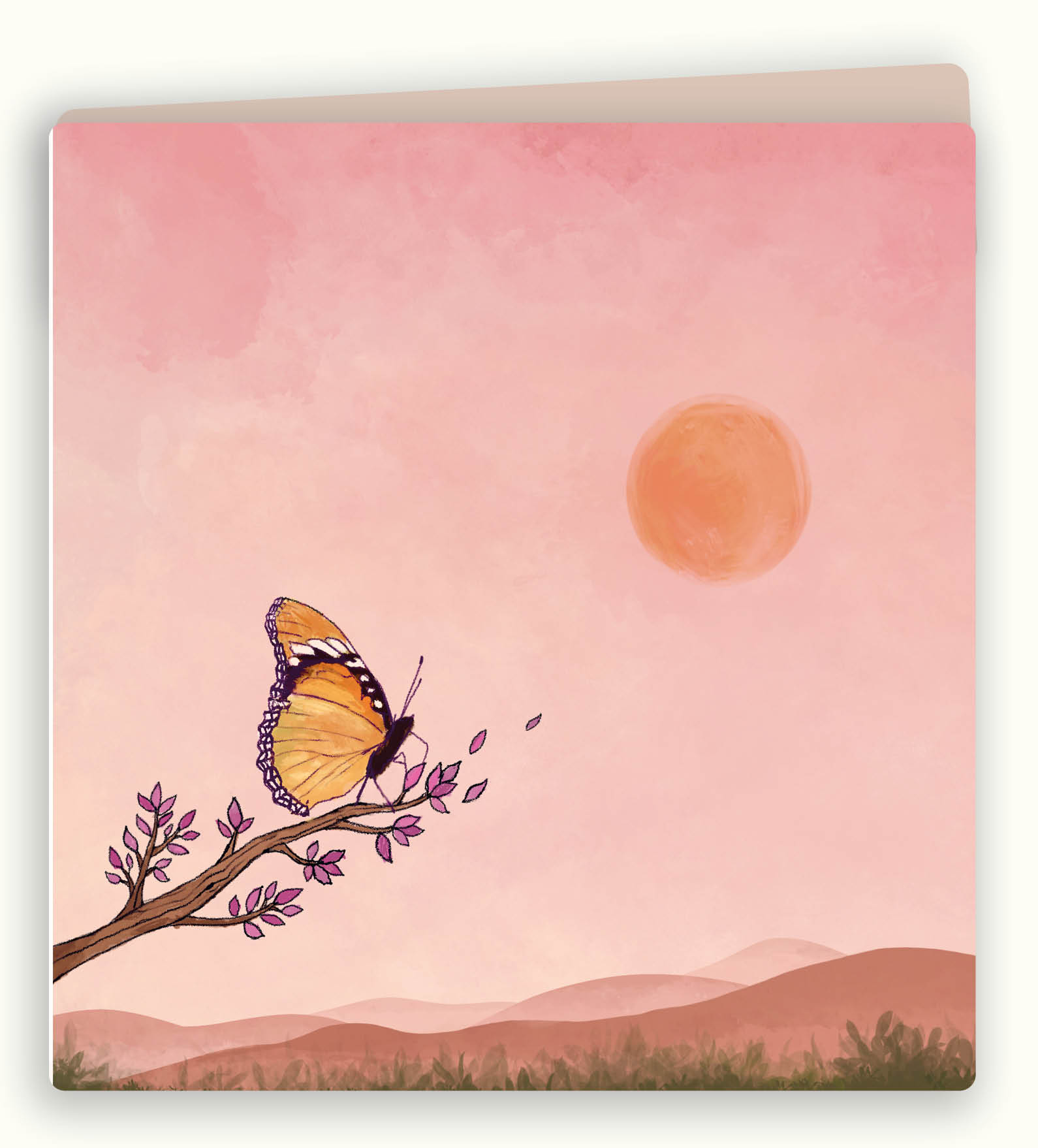 Dubbele wenskaart met de afbeelding van een vlinder op tak bij avondrood zonder tekst