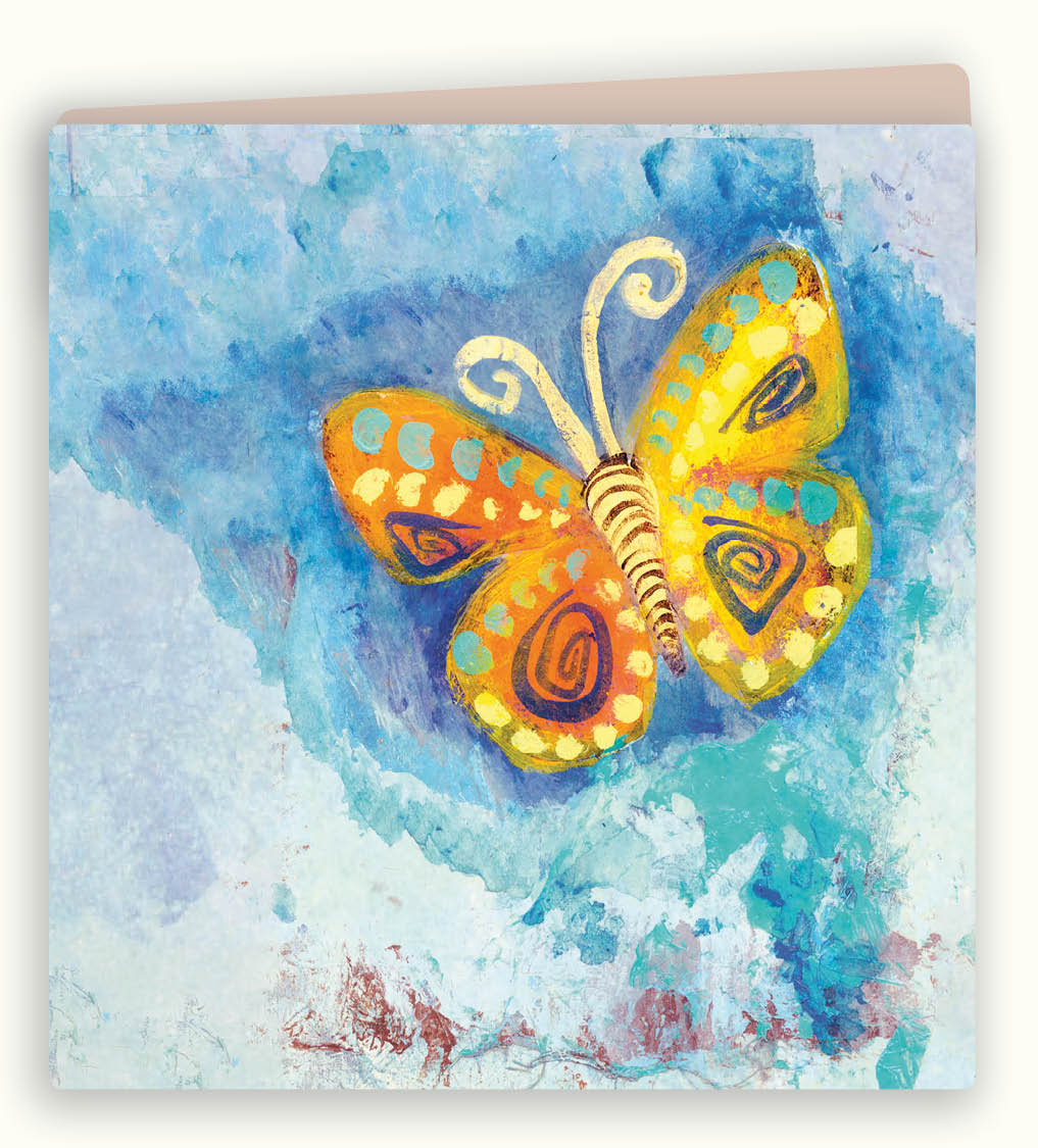 Dubbele wenskaart met de afbeelding van een getekende vlinder met blauwe achtergrond zonder tekst.