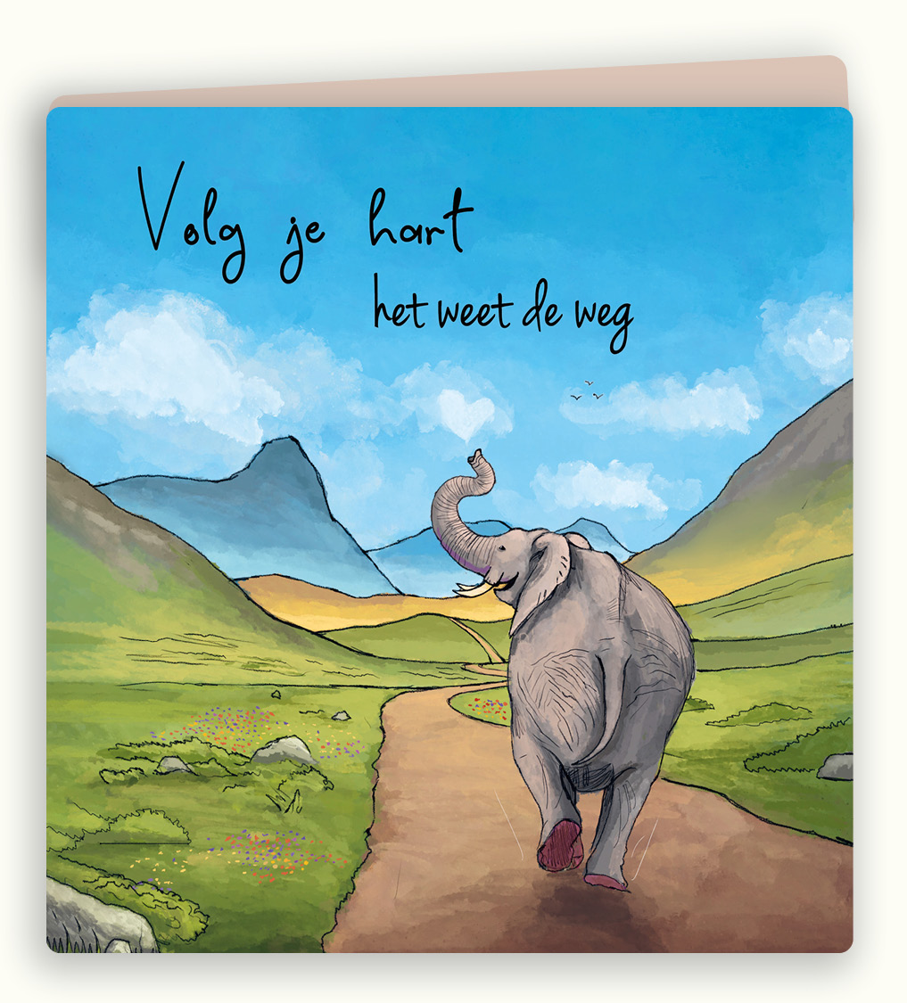 Dubbele wenskaart met de afbeelding van een olifant onderweg in berglandschap met de tekst ‘Volg je hart het weet de weg’.