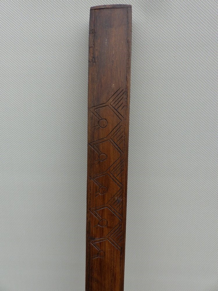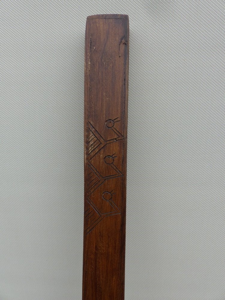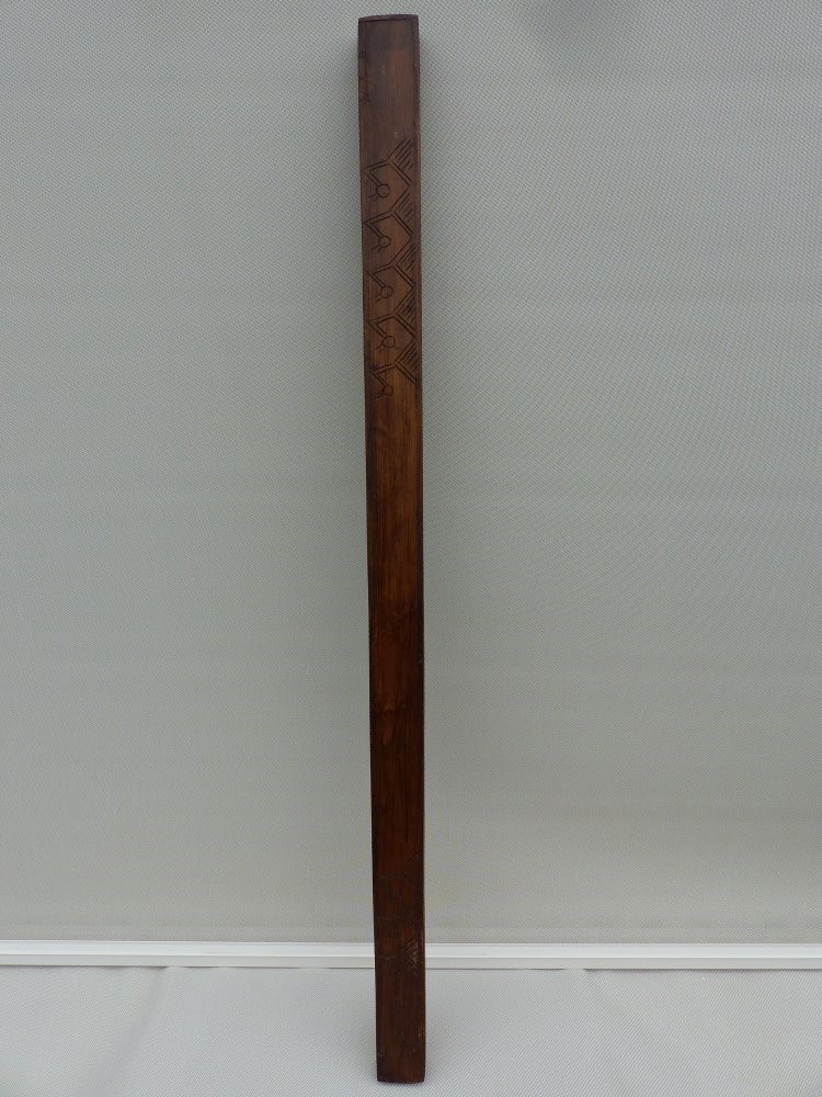 Deze houten rainstick is voorzien van houtsnijwerk aan beide uiteinden, en is vierkant.