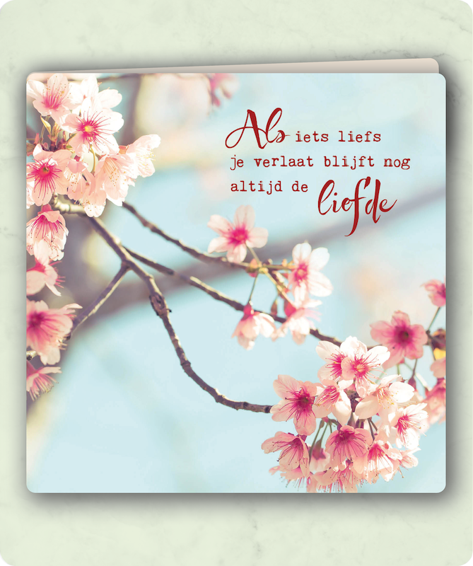 Kaart met witte bloesemtak en tekst 'Als iets liefs je verlaat blijft nog altijd de liefde'
