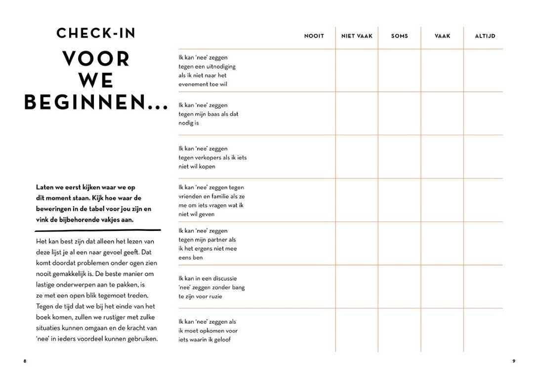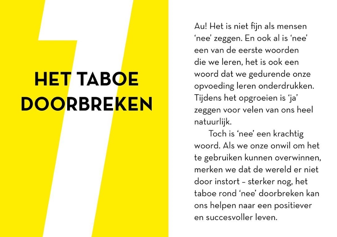Door het gebruik van dat ene woordje en dit slimme boek kun je het taboe dat om het woord 'nee' heen hangt doorbreken en je behoefte leren begrijpen.